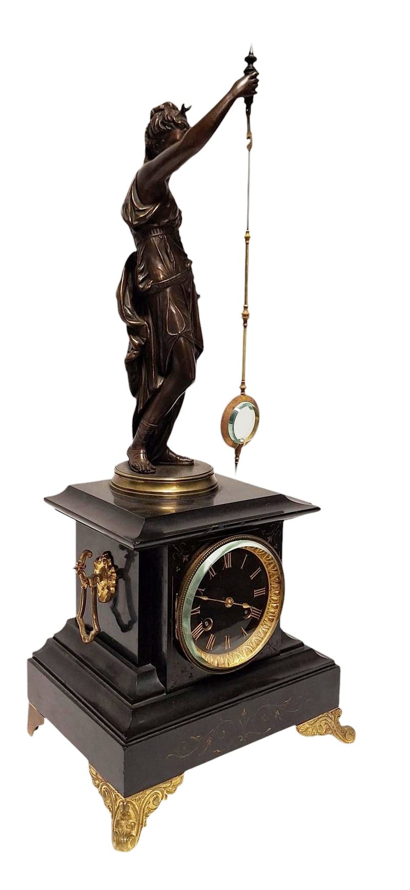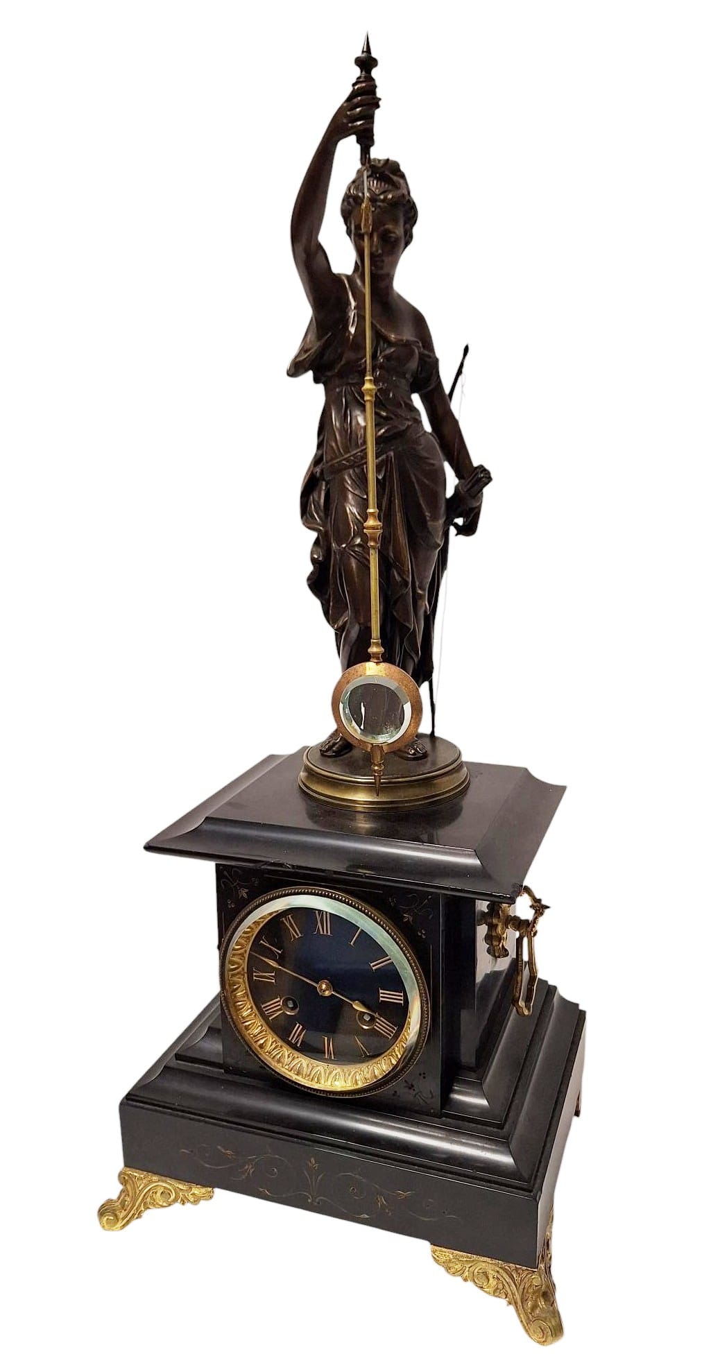 RARE PENDULE MYSTERIEUSE NAPOLEON III à base en marbre noir et bronze doré surmonté d’une statue en régule tenant le balancier.