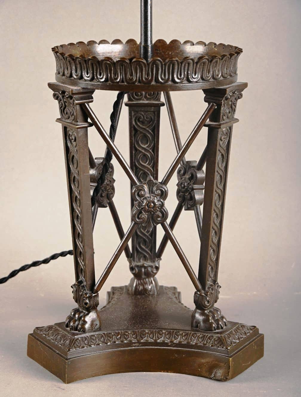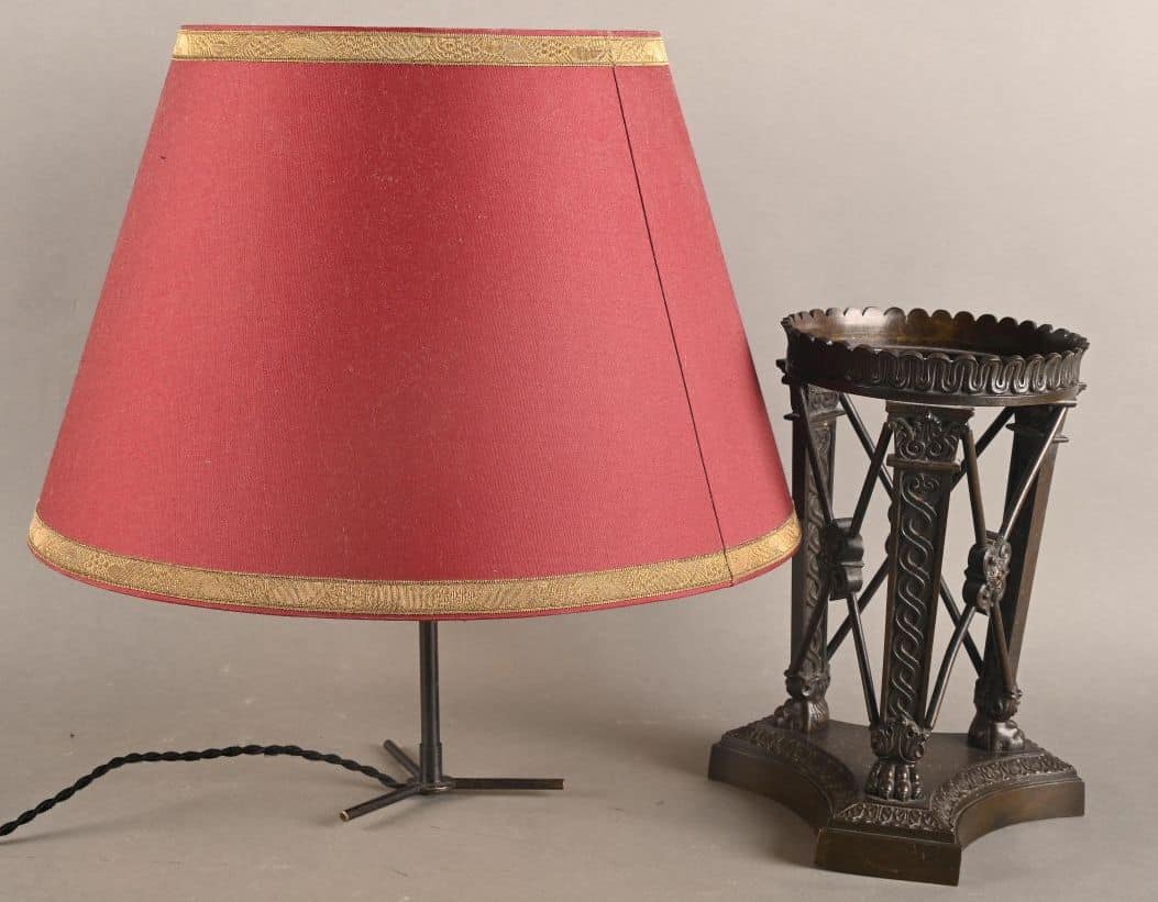 Lot n°108 – Porte ananas en bronze patiné monté en lampe.