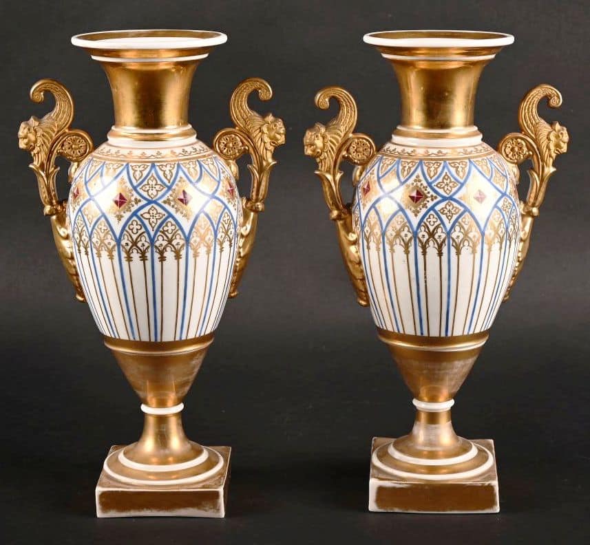 Paire de vases en porcelaine de Paris à décor en réserve de personnages à la Troubadour, fond doré et arcatures néogothiques soulignées en bleu. Anses à griffons.