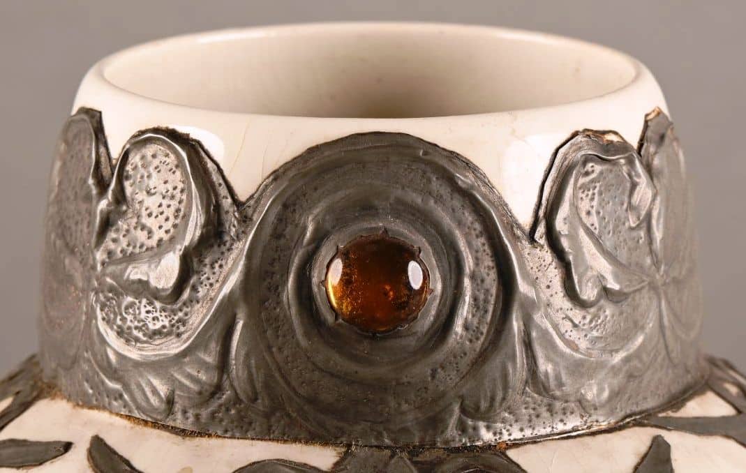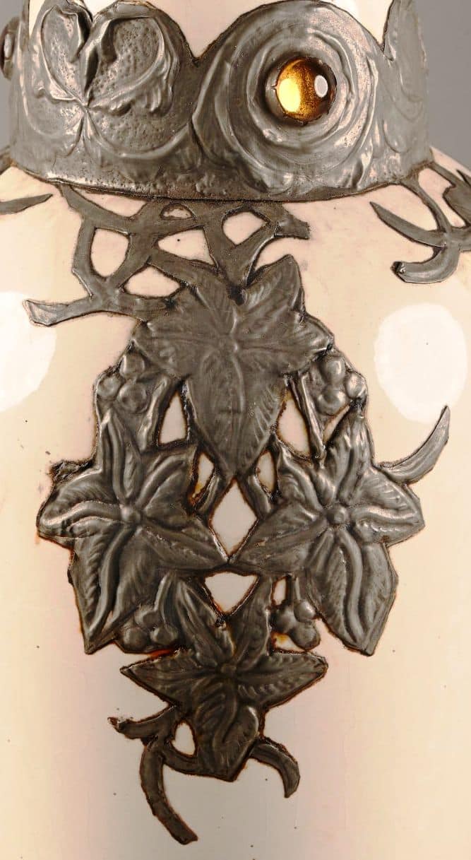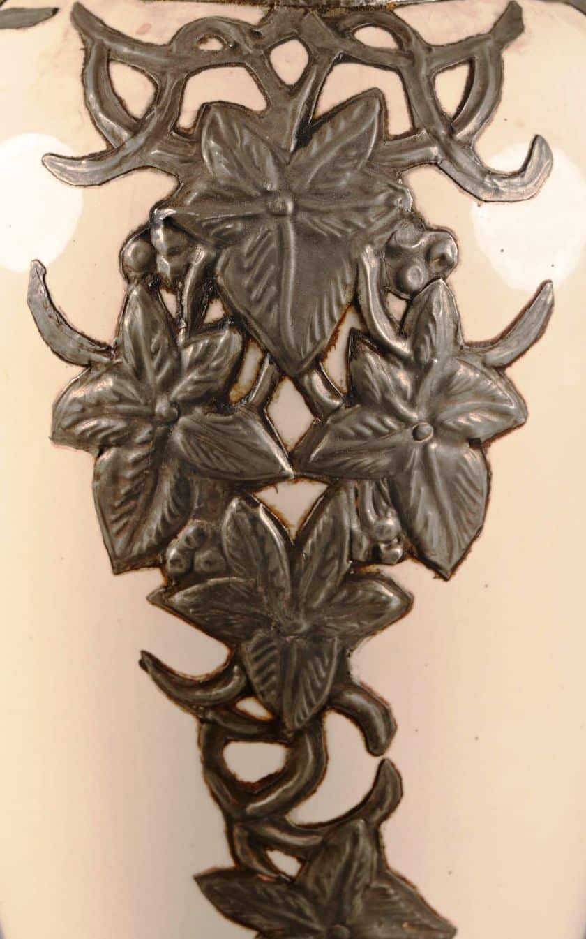 Grand vase en céramique de Boch La Louvière à fond blanc incrustation de motifs floraux en étain et cabochons.