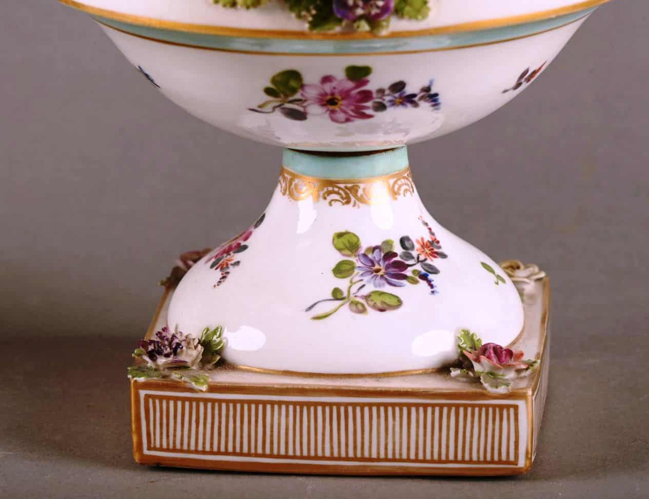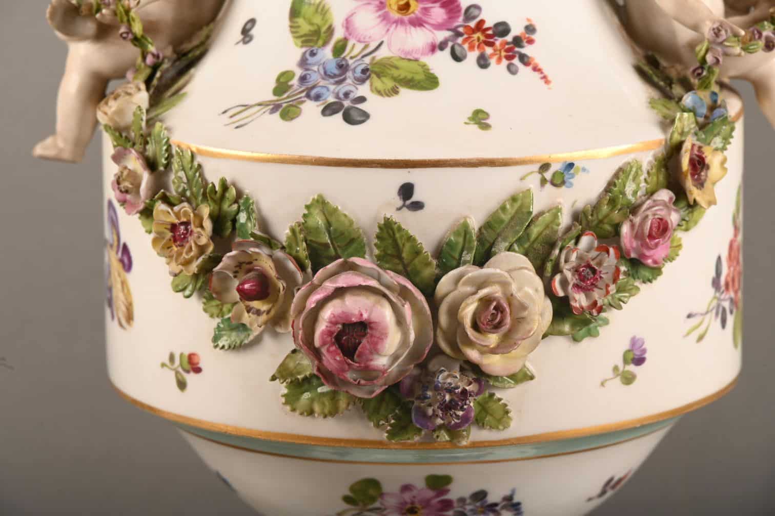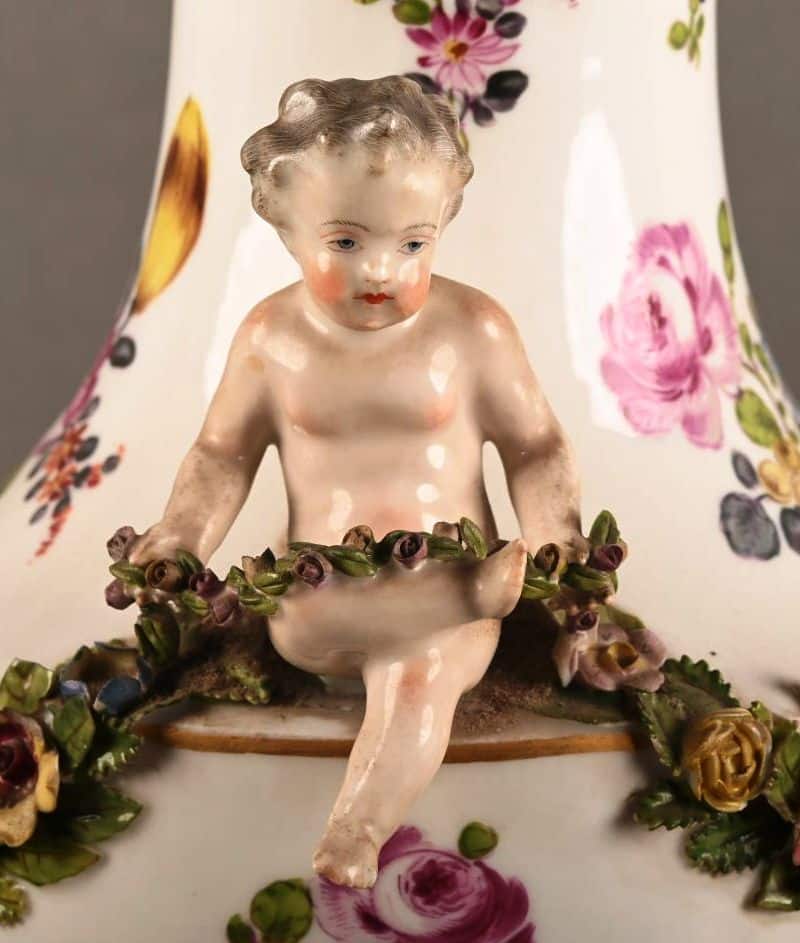 Paire de vases gaines en porcelaine blanche à décor de brindilles et bouquets fleuris multicolores. Guirlande fleurie et putti en anse. Dans le goût de Meissen. En l’état.