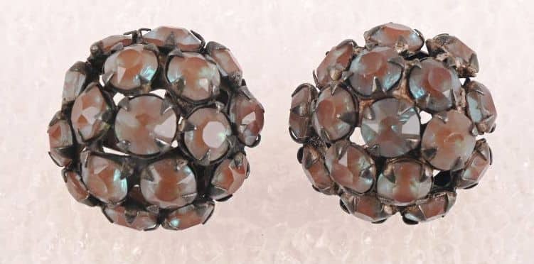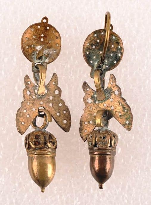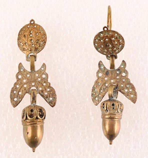 Boucle de ceinture, chaînette avec poignard, boucles d’oreilles et deux colifichet en cuivre doré.
