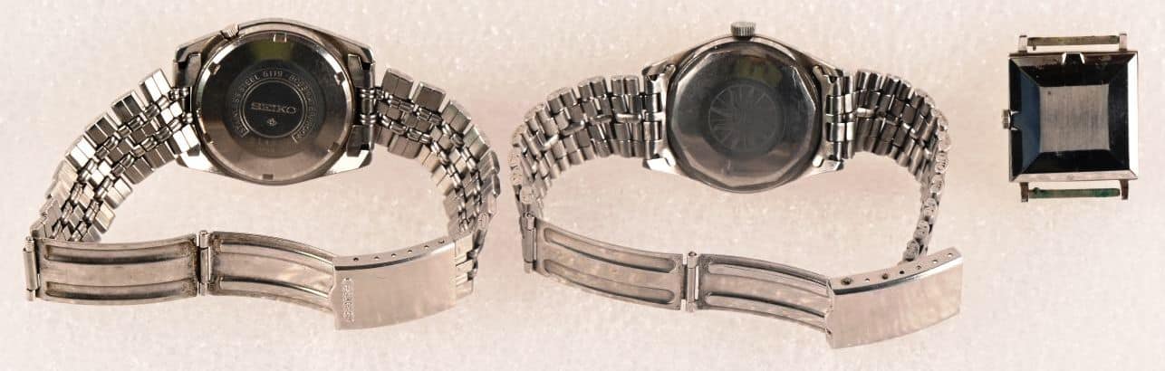 Une montre Seiko “5“, réf. 6119-8093, automatique, à date et quantième. Remontoir à quatre heures. Bracelet original. Circa 1971 (largeur : 36 mm.) Une montre Tissot Automatic Seastar en acier, vers 1970 (largeur : 34 mm). Une montre Oméga à mouvement mécanique 620 et boîtier carré aux index “bâton“. Métal. Sans bracelet. Travail des années 60-70.