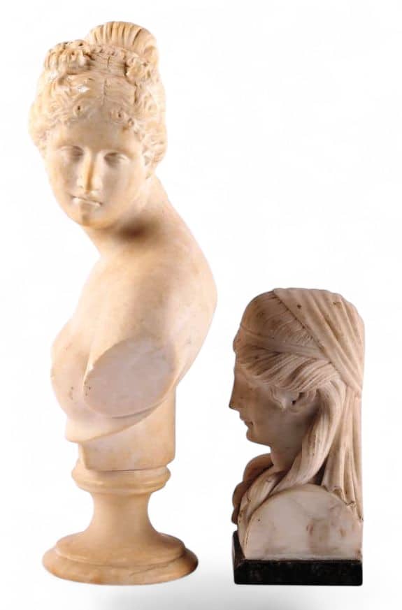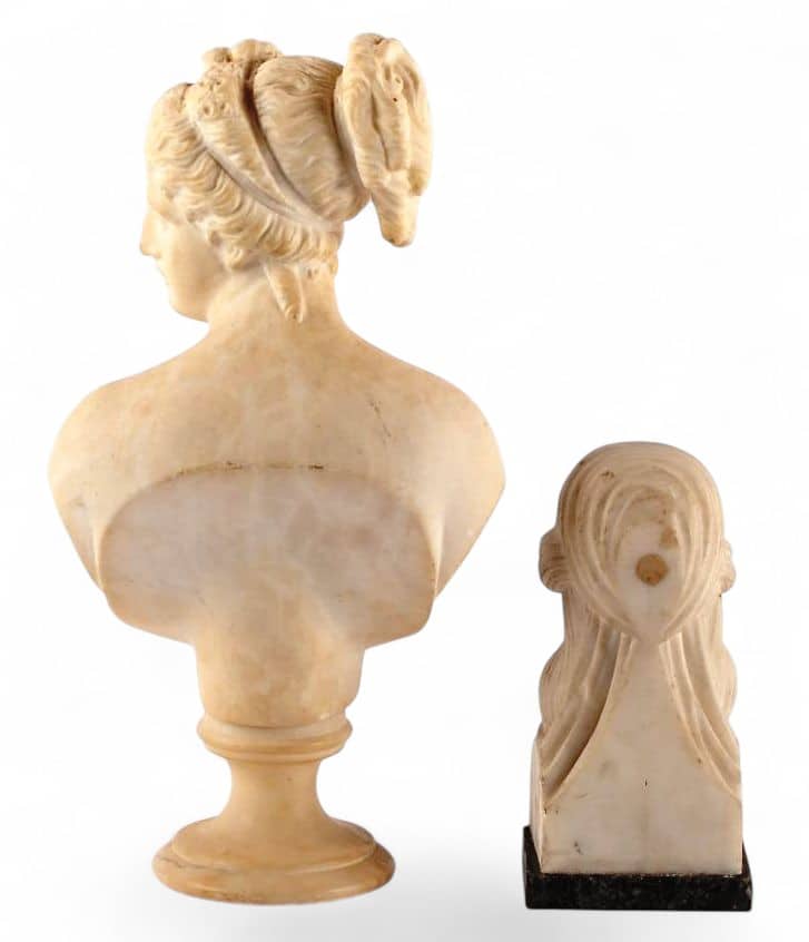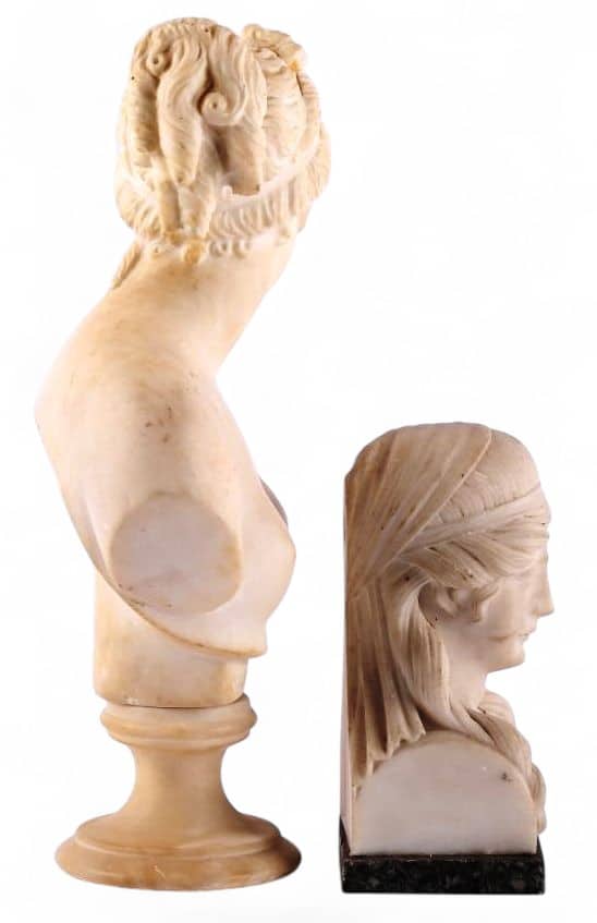 On y joint un buste à l’Antique du début du XIXe siècle en albatre et marbre gris. H : 15 cm