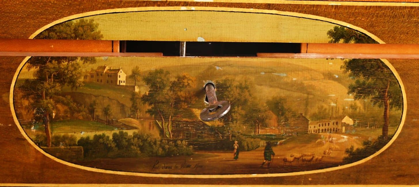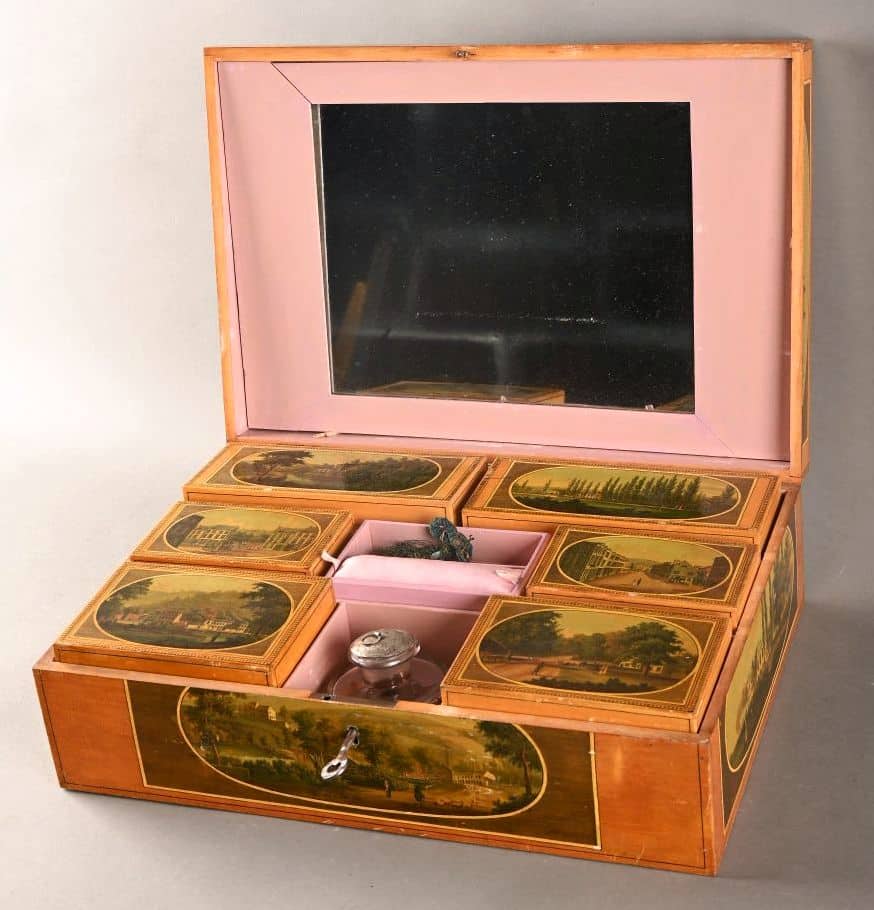 Intérieur composé de 6 boîtes à décor de paysages spadois identifiés, une carfe et un nécessaire.