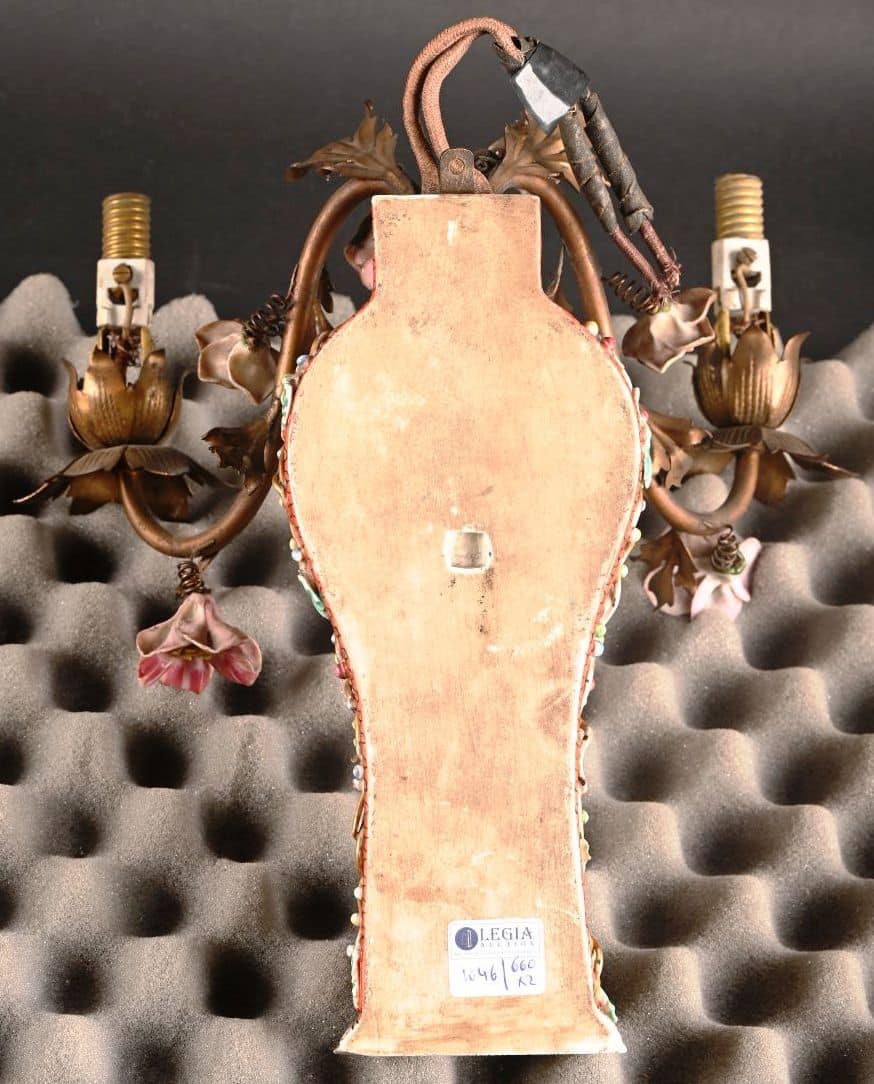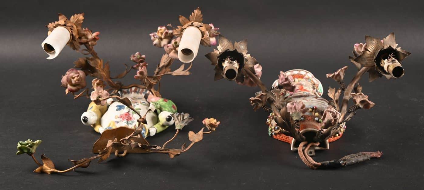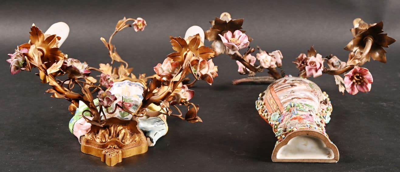 Suite de deux appliques différentes en porcelaine polychrome à décor chinois à deux points de lumière. Monture en bronze doré de branchages feuillagés et fleuris de porcelaine.