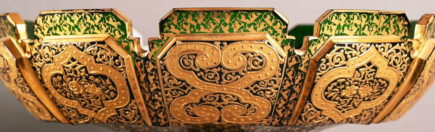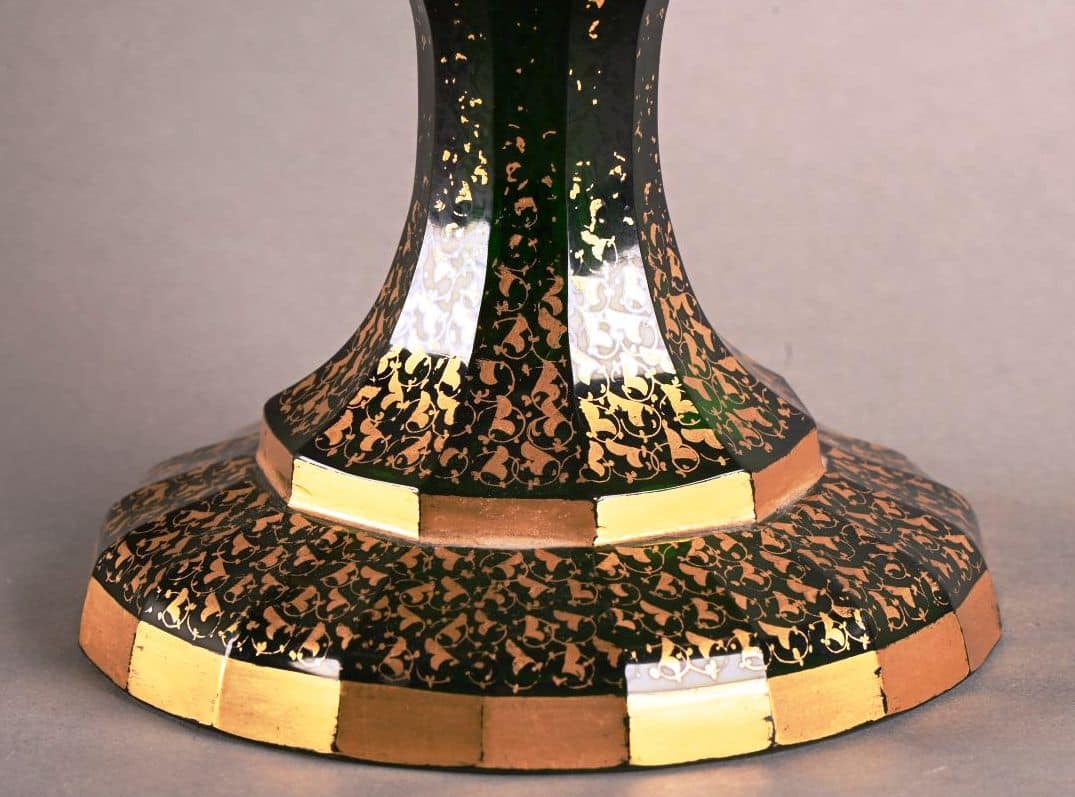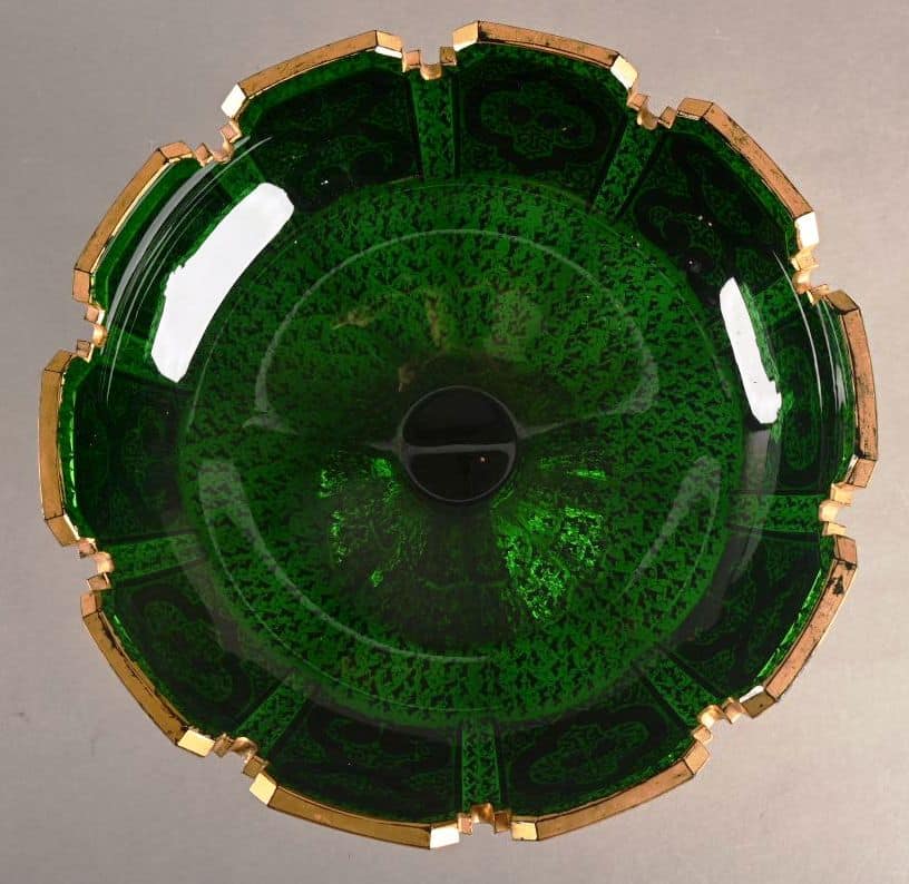 Grande coupe sur pied circulaire en cristal émeraude, bord crenelé, riche décor doré