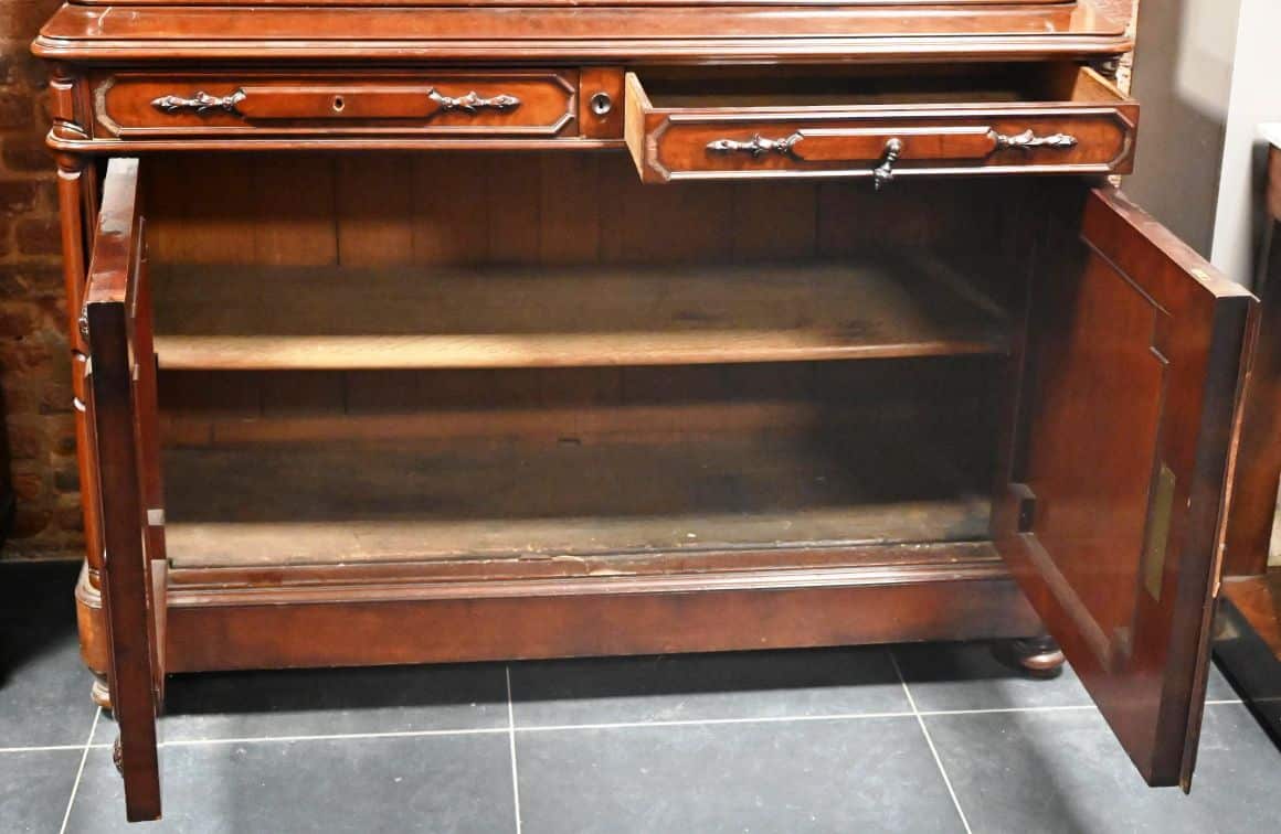Deux-corps vitrine Louis-Philippe en acajou à deux ouvrants en partie basse, deux tiroirs en ceinture et deux vantaux vitrés en partie haute. Corniche en chapeau de gendarme.