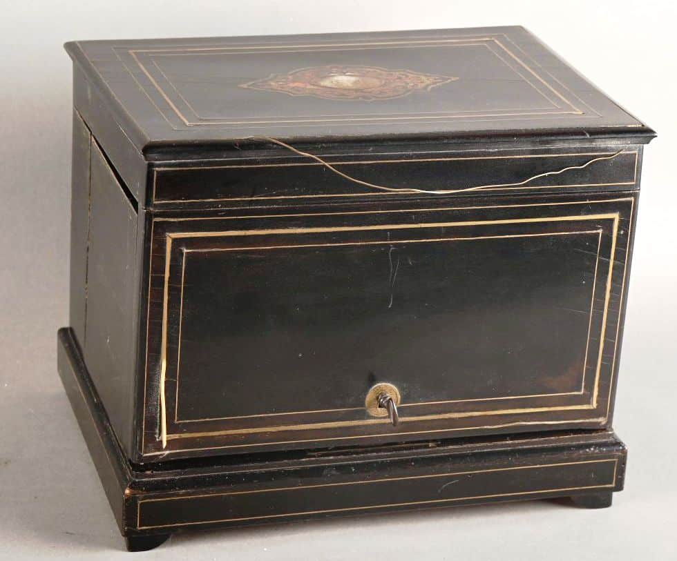 Cave à liqueur en bois noirci avec incrustaions d’écailles et de laiton.