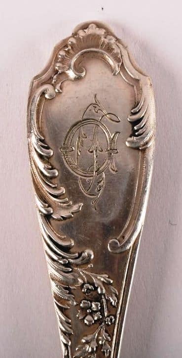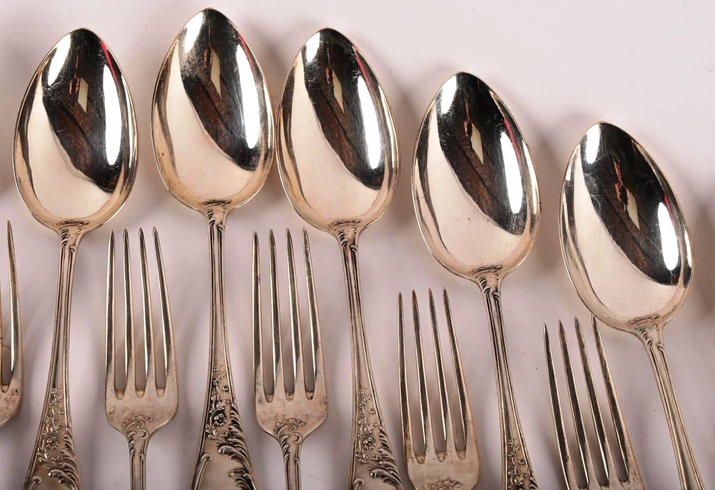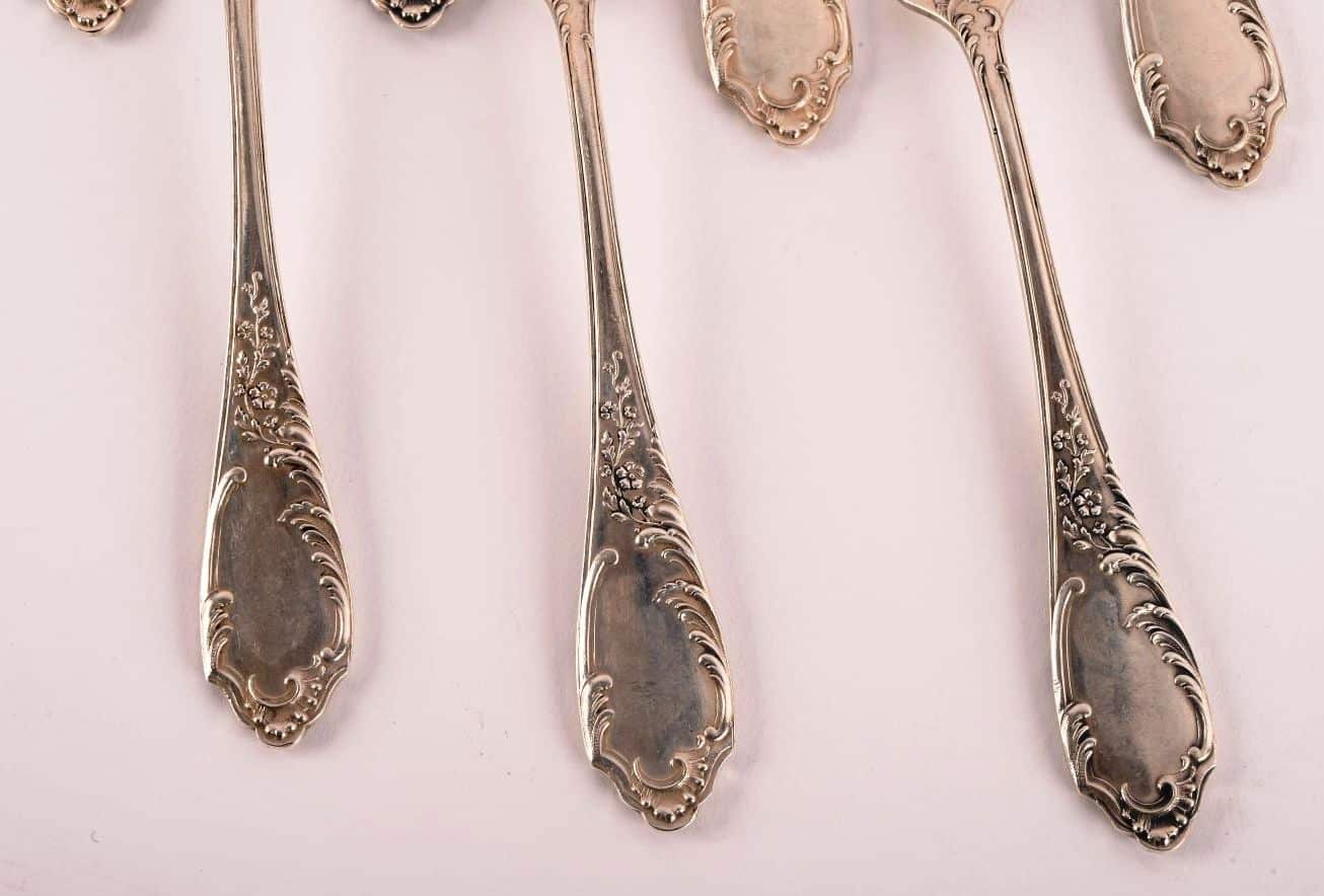 Couverts en argent 800, suite de 12 grandes fourchette et 9 grandes cuillères, décor rocaille, chiffrés.